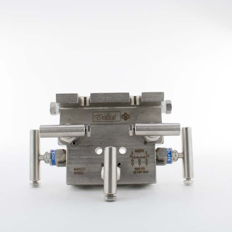 5 Valve Manifold Pola Lebar 316SS 1/2 In FNPT x Flange Orifice .187 Seal Inti Tekanan Teflon Dudukan Delrin, Parker PGI No. Bag. M-675SDT